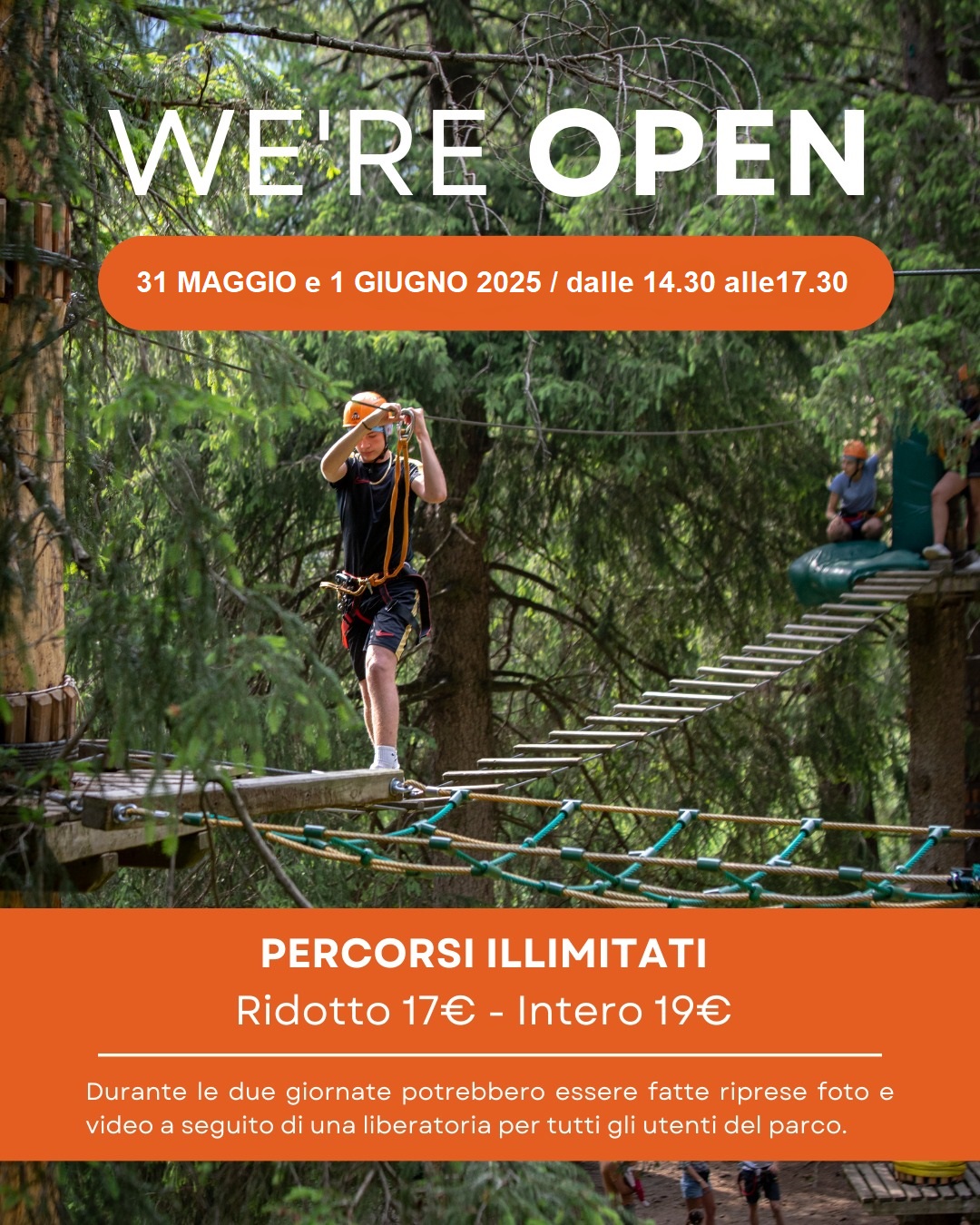 NB: durante le giornate di sabato 31 maggio e domenica 1 giugno verranno effettuate riprese foto e video e per accedere ai percorsi del parco avventura sarà necessario firmare una liberatoria (sia per i minori che per i maggiorenni).